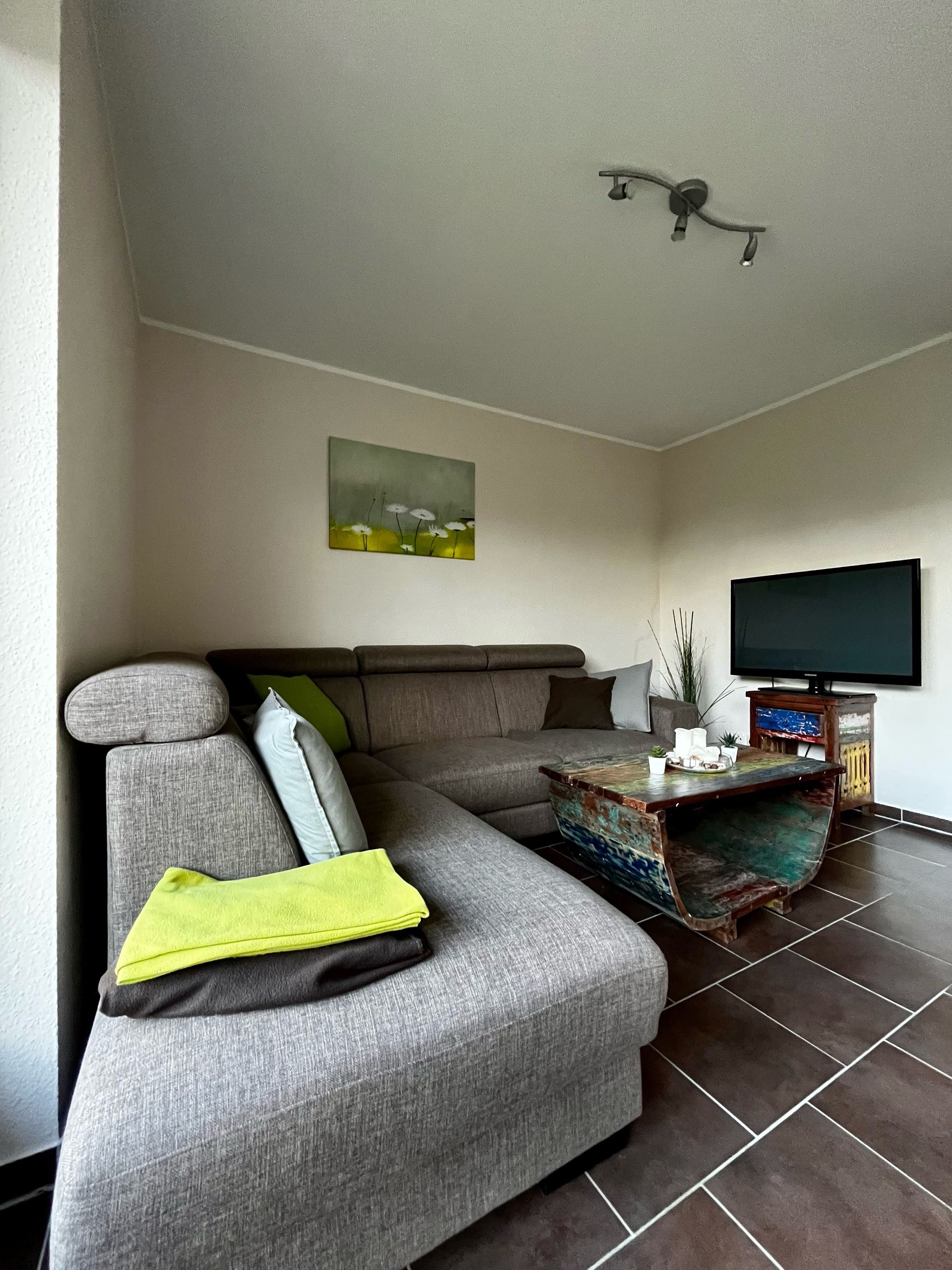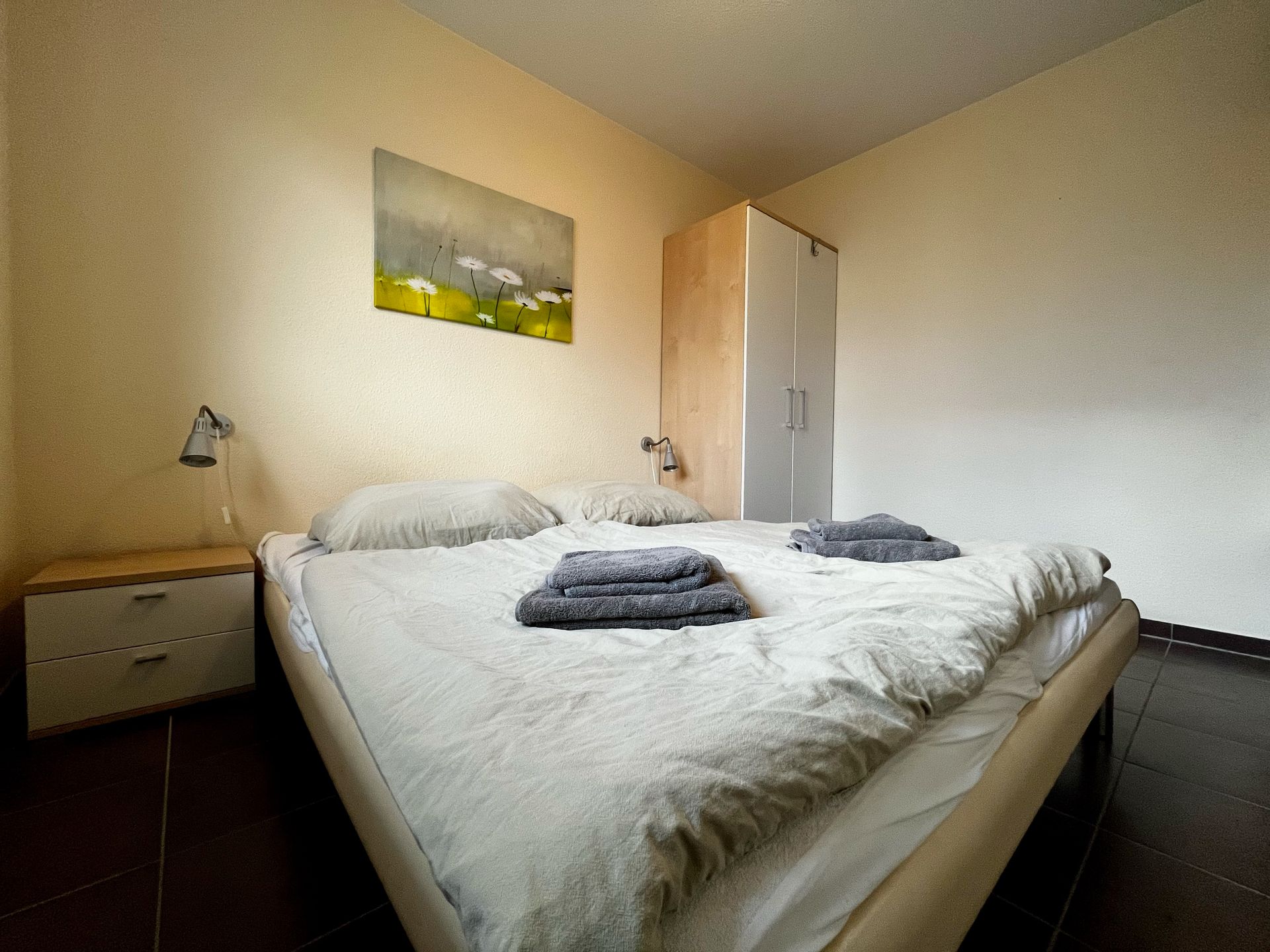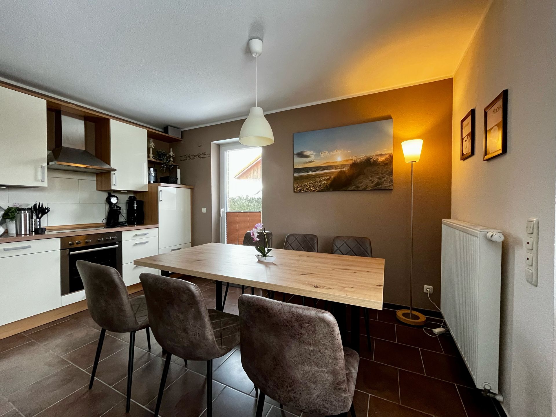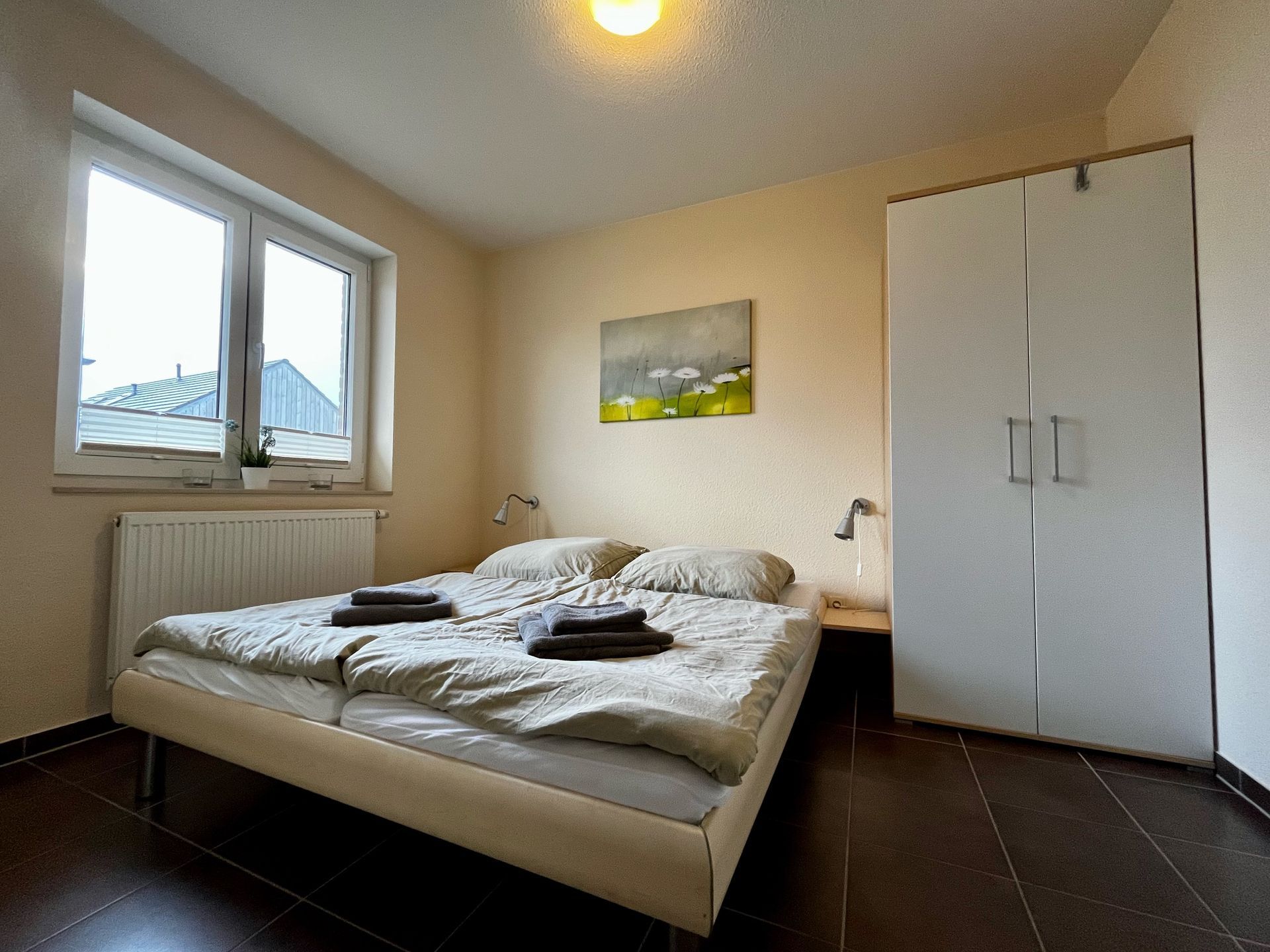Die 4-Zimmer-Doppelhaushälfte in Massivbauweise für bis zu 6 Personen umfasst ca. 80 m². Im Erdgeschoss finden Sie neben einem Schlafzimmer mit Doppelbett einen geräumigen Wohnraum mit Couch und TV. An den Wohnbereich schließen sich ein separater Essplatz und eine voll ausgestattete Küche mit Kaffeepadmaschine an. Außerdem befindet sich im Erdgeschoss ein Bad mit Dusche und WC.