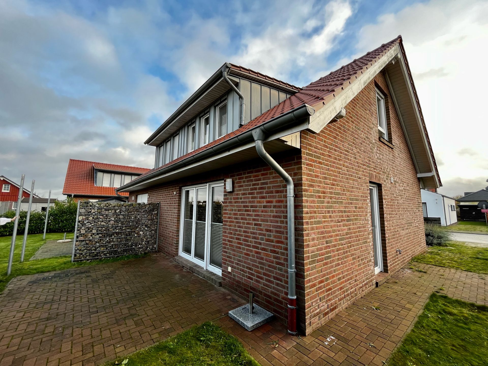 Außen verfügt das Haus über eine befestigte Terrasse mit Möbeln und einem Grill. Ein Parkplatz befindet sich auf dem Grundstück, ein weiterer öffentlicher Parkplatz liegt vor dem Gebäude.