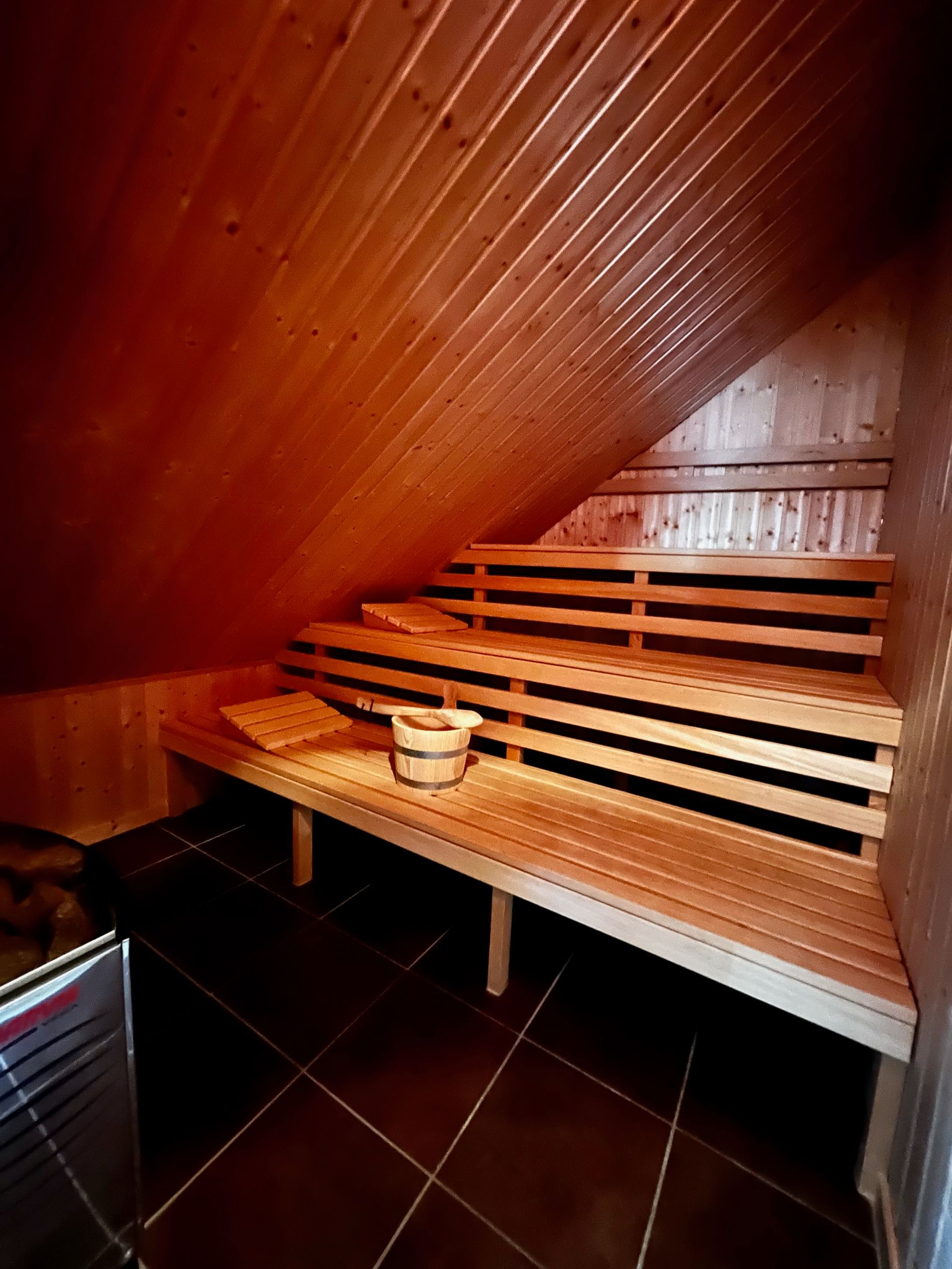 Im Dachgeschoss befindet sich ein weiteres Schlafzimmer mit einem Doppelbett sowie das dritte Schlafzimmer mit zwei Einzelbetten. Ein Kinderreisebett nebst Matratze ist vorhanden, ebenso Handtücher. Die Betten sind bei Anreise bezogen, Bettwäsche für Kleinkinder ist selbst mitzubringen). Neben den Schlafräumen verfügt das Obergeschoss über ein zweites Bad mit Dusche und WC, sowie einer Sauna für 4 Personen.